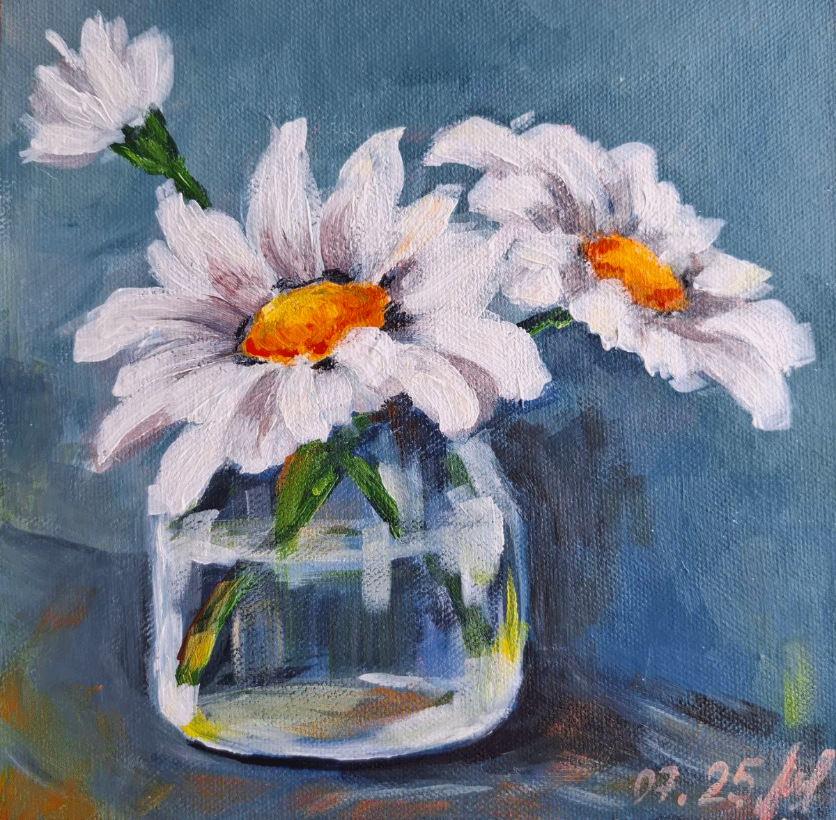На картине изображён нежный натюрморт с ромашками, стоящими в стеклянной банке. Белоснежные лепестки цветков контрастируют с ярко-жёлтыми сердцевинами, привлекая внимание своей свежестью и искренней простотой. Мягкие мазки и приглушённый голубой фон создают ощущение лёгкости и уюта. Прозрачная банка с отражениями света добавляет композиции реалистичности и глубины. Эта работа передаёт атмосферу спокойствия и напоминает о летних днях, наполненных теплом и гармонией. Картина отлично впишется в интерьер, привнеся нотку природы и света.